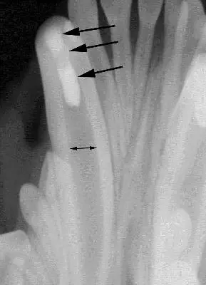 Seven years after initial treatment, the patient presented with an oblique complicated crown/root fracture of 404, which was of unknown etiology and duration. A complicated fracture is one that involves the root canal system of the tooth. The fracture extended under the gingival margin in an oblique fashion and the root canal could be clearly seen in the fracture site. Figure three shows the initial radiograph. Due to the geometry of the radiograph, the oblique nature of the fracture is not readily apparent.