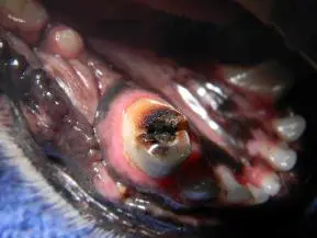 This case illustrates several interesting points. It shows the desired outcome of vital pulp therapy and illustrates the importance of follow-up radiographs to ensure that teeth treated with vital pulp therapy remain vital and continue to develop. It also shows that many fractured teeth can be restored with available periodontal and restorative techniques. The goals of treatment for this patient were to avoid a traumatic extraction, to maintain adequate crown height to help keep the patient’s tongue in the mouth when panting and to allow continued function of the tooth for picking up and holding objects in the mouth. Additional crown height could have been achieved either with a larger pin placed further down into the root canal space or by placement of a crown on the tooth. The restorative solution utilized for this patient was completed in one visit and met the treatment goals stated.