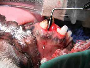After removal of the fragment, a surgical periodontal flap was made to gain access to the fracture site, several small fracture fragments were removed and root canal therapy was performed. The damaged areas of the surrounding bone was then contoured to a normal shape and de-mineralized freeze-dried bone graft was placed into a vertical bony defect created by the fracture. The crown was then restored to a more normal shape with composite restorative material, utilizing a small pin placed in the dentin. The pin provides additional retention for the composite restoration, allowing more complete restoration of the crown. The final step was suturing the periodontal flap carefully around the tooth, taking care to surround the entire tooth with a collar of attached gingiva.