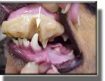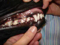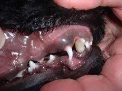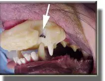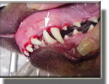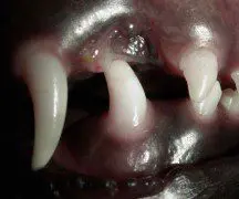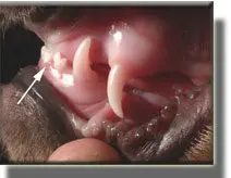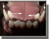 This 10 week puppy has painful lesions in the roof of the mouth created by the malpositioned lower canine (fang) teeth.