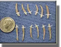 All the deciduous (baby) incisors were extracted. The white lines separate the visible part of the tooth from the root. Note how much longer the roots are by comparison. The entire root must be extracted.