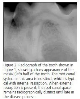 Internal resorption begins within the endodontic system, usually in the crown of the tooth. The affected area of the tooth becomes indistinct, and the outline of the root canal spaces becomes less distinct in the area of resorption (Fig. 2).