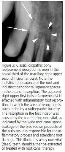 Idiopathic bony replacement resorption) is commonly seen in older patients. The premolars (cheek teeth) are most commonly affected. The process usually begins at the root and progresses towards the crown(Fig. 3). Many affected teeth never have more than 1/3 to 1/2 of the root affected. Still, the process may continue until the entire root structure of the tooth is resorbed and the crown of the tooth is mobile. During resorption, the affected part of the root is typically ankylosed (fused) to the surrounding bone in the area of resorption, eventually becoming replaced by trabecular bone, hence the term replacement resorption. In some cases, the resorption can start in the mid-root area (Fig. 4). In most cases, no radiographic lysis is appreciated in the areas of resorption.