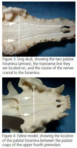 Technique: Place the block just caudal to the area desired to be blocked. Imagine the line halfway between the midline and arcade, advance the needle to the palate, and place the block. An obvious bleb will be seen, confirming the placement of the block. The technique is the same in the cat, with the major palatine foramina being located on a line connecting the palatal cusps of the upper fourth premolars (Figure 4).