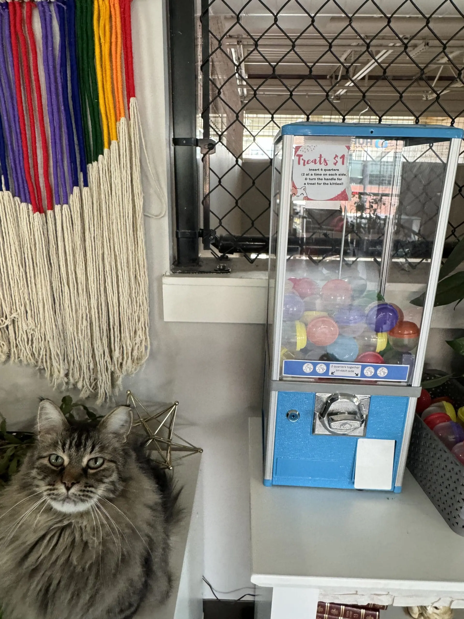 A vending machine is also present in which you can obtain treats and/or catnip for the residents. The residents are very much aware of what a human standing close to the treatment vending machine signifies. A variety of chairs and bean bags are present, allowing for human comfort. Wand toys are available for interaction. The living space is clean, and spacious allowing for a relaxing experience.